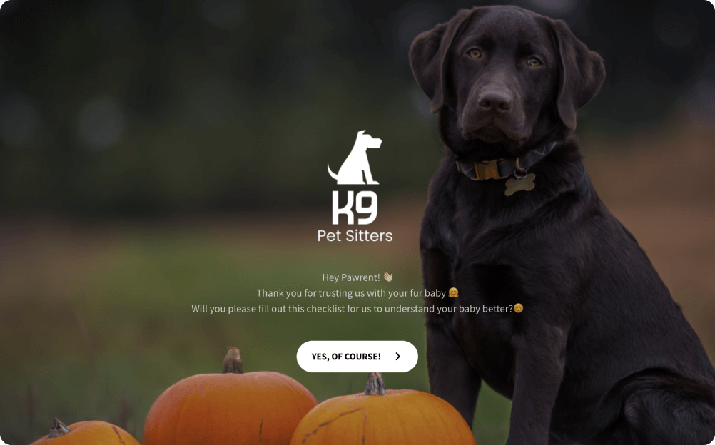 From open ended text based question type to contact form, from phone number question type to matrix question type, from upload document to number, this pet sitting checklist template supports it all. Pick the most appropriate question type for your checklist based on the answers you expect from your clients.