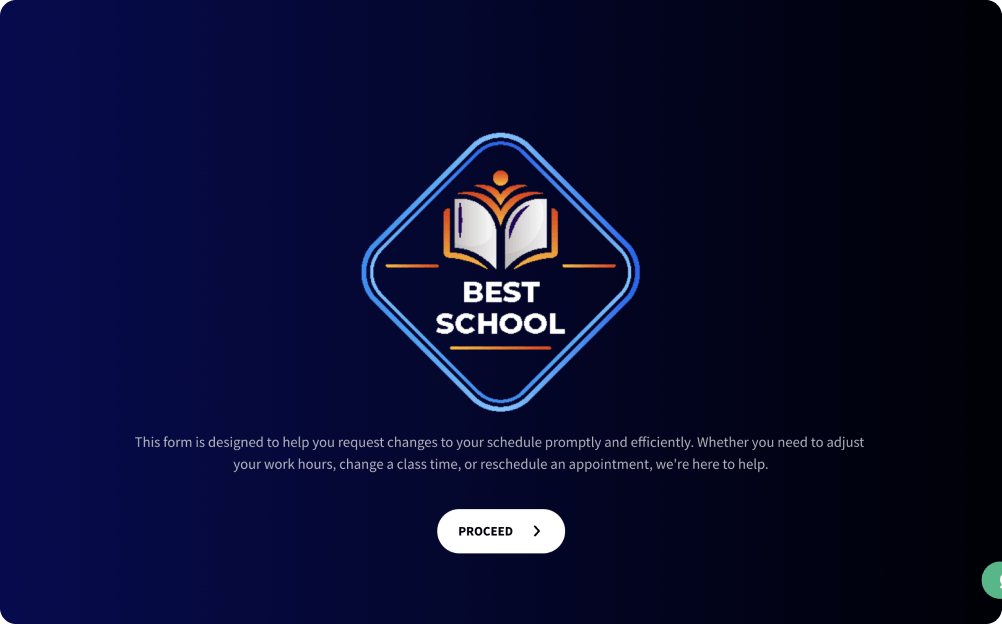 With this schedule change request form, any procedure to modify your students’ schedules becomes paperless and easy-breezy. All you need to do is pick this form and customize it your way, add your logo and colors and get ready to share them. While you’re at it, use features such as device compatibility, advanced question types, single-page view, and more.