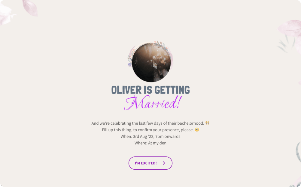 Guests can upload files directly through the questionnaire, such as photos or party suggestions. This interactive element personalizes the event planning and boosts guest involvement, making the bachelor party more memorable and engaging.